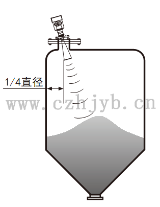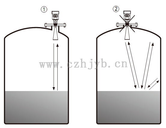 Ø 儀表不能安裝在拱形或圓形罐頂中間。除了會產生間接回波還會受到多次回波的影響。多次回波可能比真正回波的信號閥值還大,因為通過頂部可集中多個回波。所以不能安裝在中心位置。