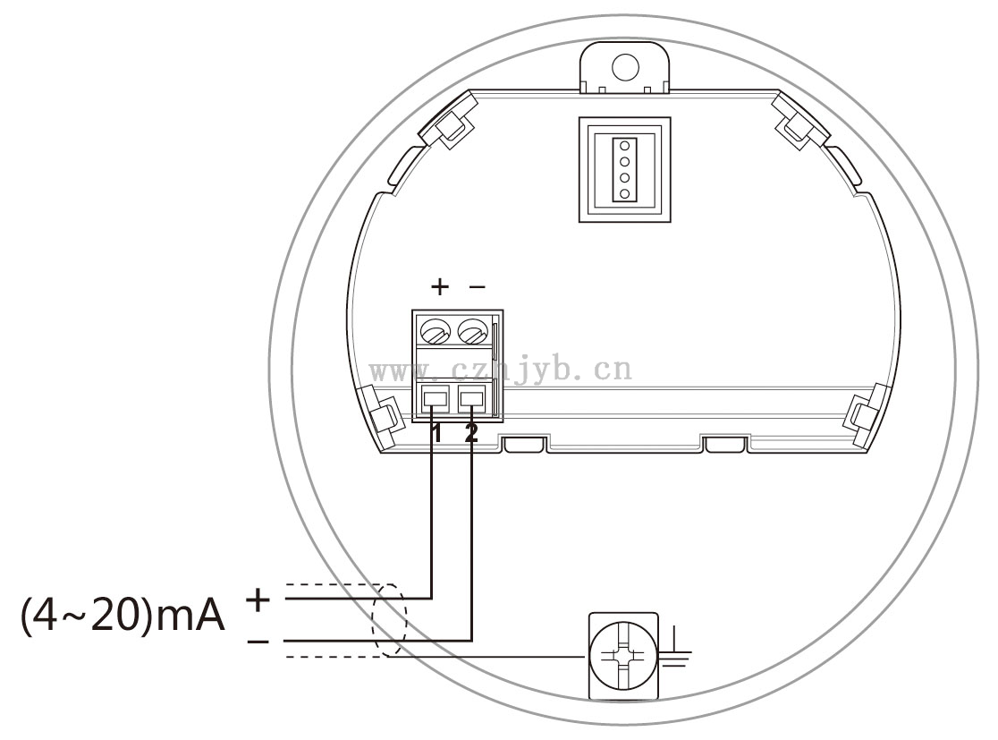 (4~20) mA/HART(兩線制)      供電電源和輸出電流信號共用一根兩芯屏蔽電纜線。具體供電電壓范圍參見技術數據。對于本安型須在供電電源與儀表之間加一個安全柵。