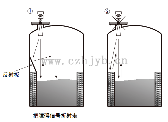 Ø 當罐中有障礙物影響測量時,要加裝反射板才能正常測量。