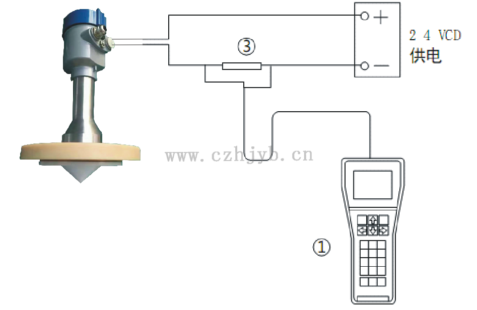 (4~20) mA/HART(兩線制) 供電電源和輸出電流信號共用一根兩芯屏蔽電纜線。具體供電電壓范圍參見技術數據。對于本安型須在供電電源與儀表之間加一個安全柵。